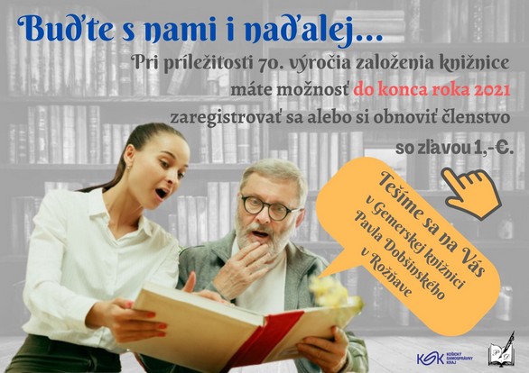Ak ste v poslednom období pozabudli na preukaz do knižnice, skončilo Vám členské alebo ste si ho ešte nestihli vybaviť, nevadí, všetko sa dá zrealizovať. Pozývame Vás do našich priestorov v rámci výpožičných hodín a ponúkame zľavu 1,-€.