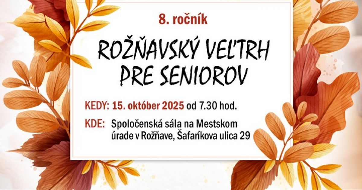Regionálny úrad verejného zdravotníctva so sídlom v Rožňave, Mesto Rožňava a Okresná organizácia Jednoty dôchodcov Slovenska v Rožňave Vás pozývajú na 8. ročník Rožňavského veľtrhu pre seniorov. Jedinečné podujatie, ktoré má svoj príbeh a svoju históriu, sa uskutoční 15. októbra 2025 so začiatkom od 7:30 hod. v Spoločenskej sále na Mestskom úrade v Rožňave na Šafárikovej ulici.